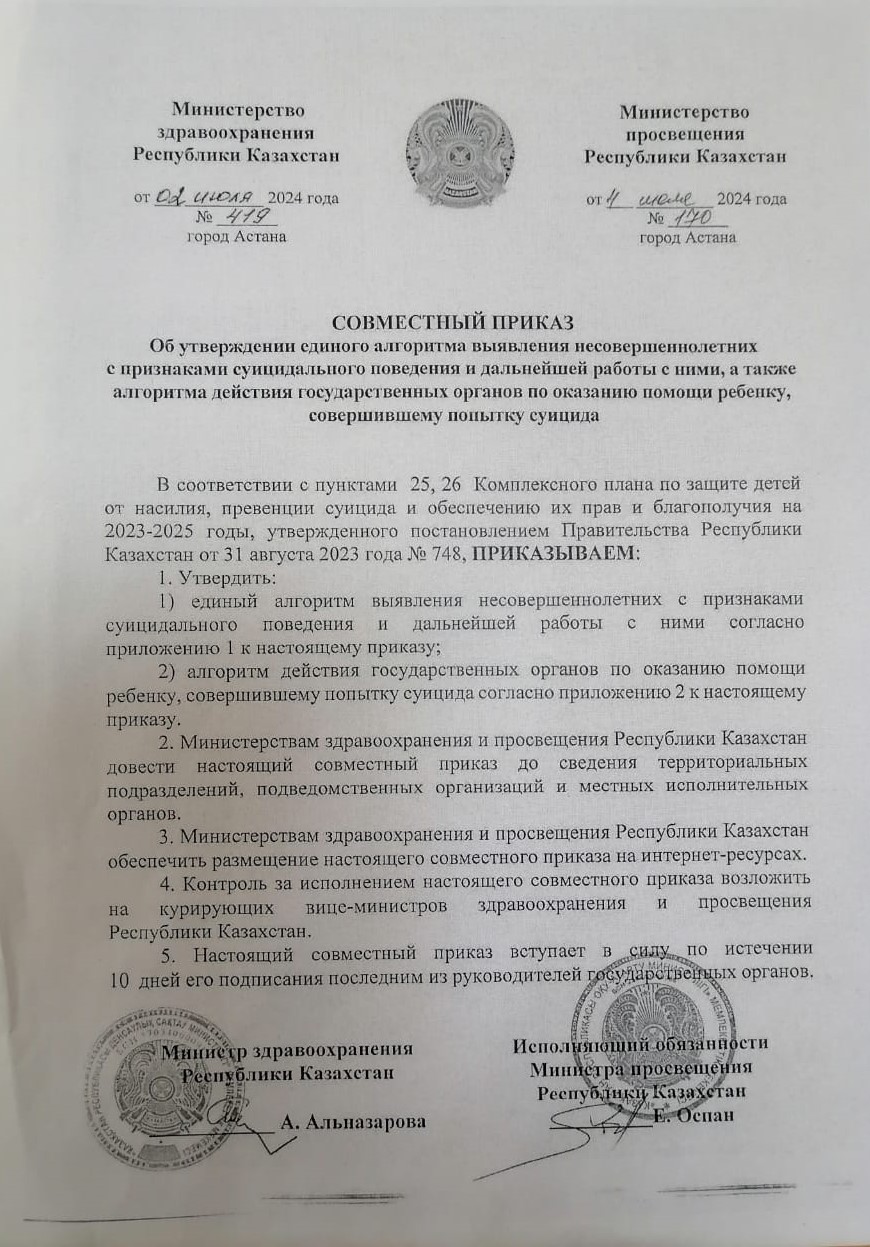 Об утверждении единого алгоритма выявления несовершеннолетних с признаками суицидального поведения и дальнейшей работы с ними, а также алгоритма действий государственных органов по оказанию помощи ребенку, совершившему попытку суицида