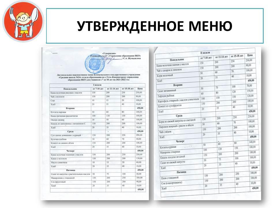 Утвержденное меню » Коммунальное государственное учреждение "Средняя школа № 24" акимата города Усть-Каменогорска